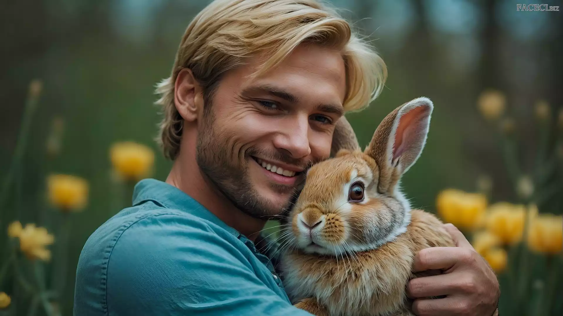 Mężczyzna, Blondyn, Królik, Uśmiech - faceci.biz